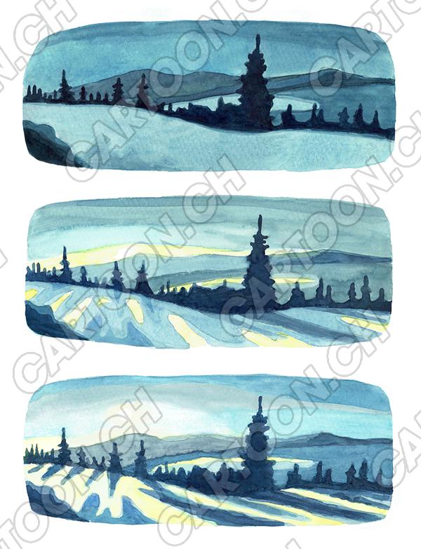 Tags: Landschaft Illustration Weihnachten Winter Grusskarte Fettagskarte Neujahr Sonnenaufgang