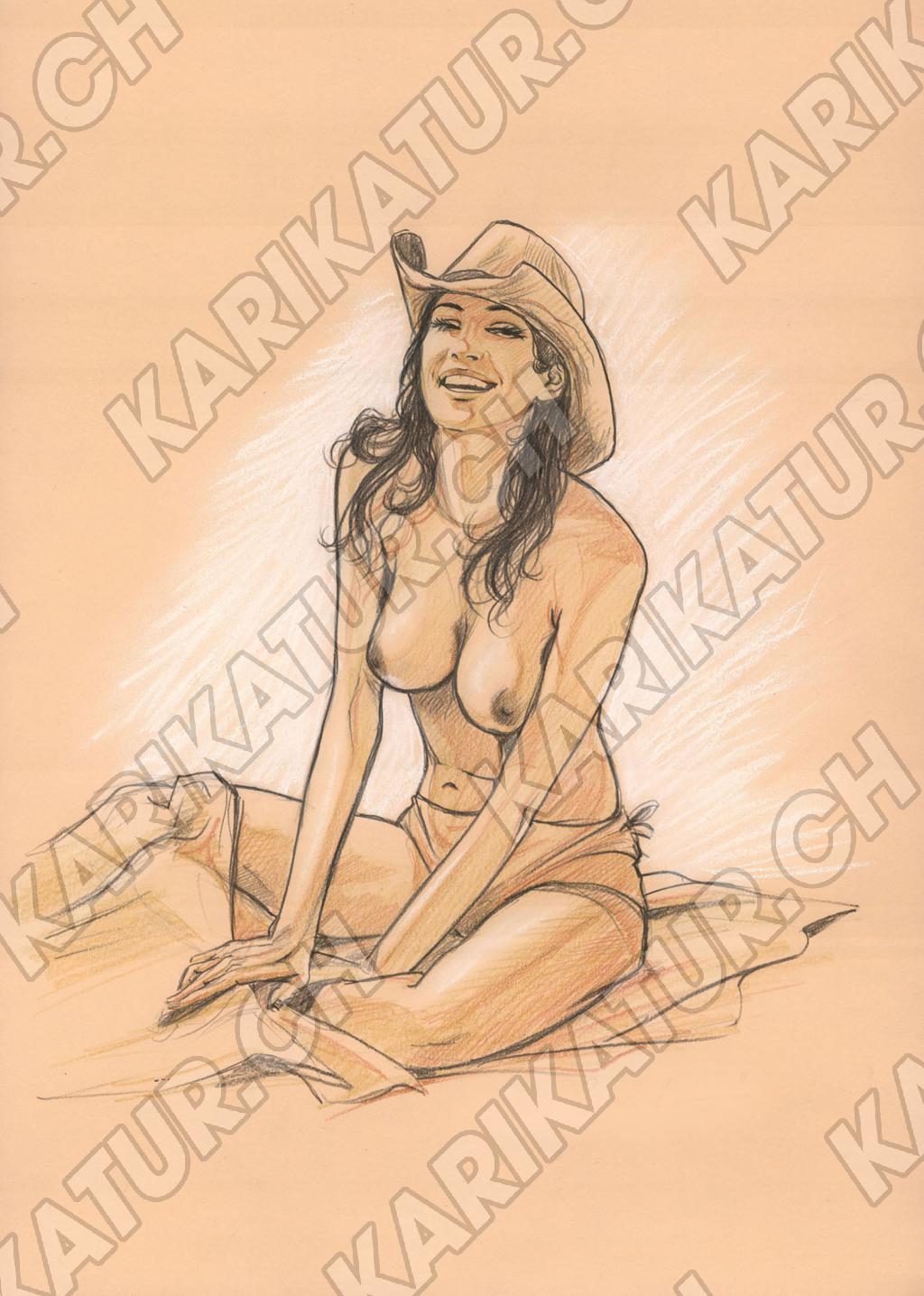 Tags: Frau Lachen Pinup Farbstift sexy Cowboyhut nackt sitzend