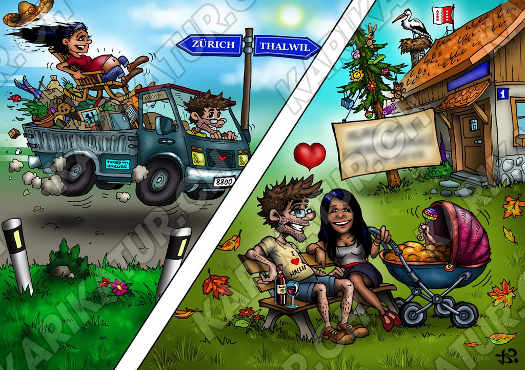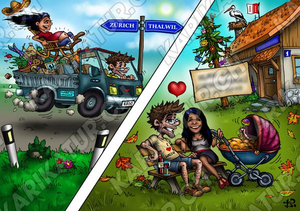 Tags: Karte Karikatur Umzug Geburt Geburtsanzeige Postkarte Familie Zügeln neue Adresse