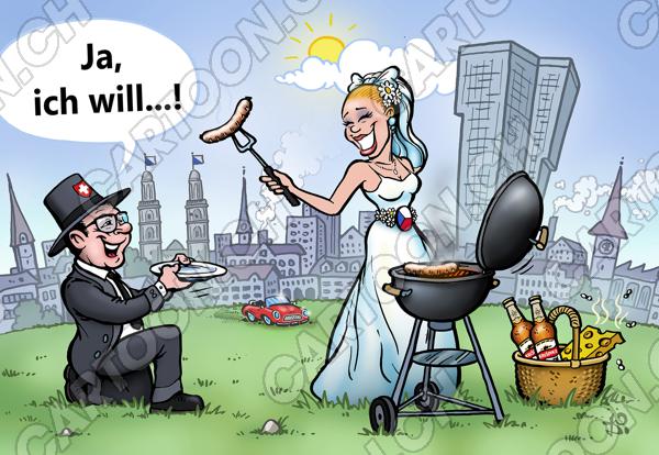 Tags: Karte Hochzeit Heiraten Antrag Braut Bräutigam Karikatur Hochzeitsanzeige Hochzeitskarte Grill Wurst Zürich