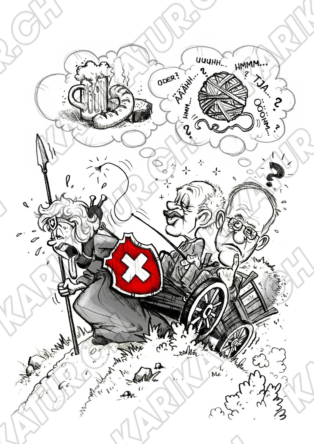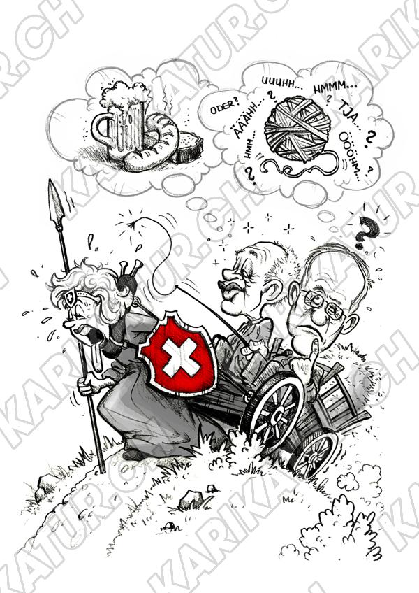 Tags: schwarz weiss grau schwarzweiss Karikatur Politik Helvetia Bundesrat Schneider-Ammann Ueli Maurer