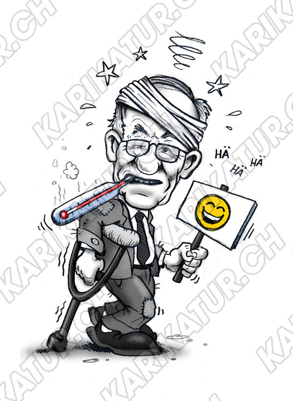 Tags: schwarz weiss grau schwarzweiss Karikatur Politik Bundesrat Schneider-Ammann Helgen Schnitzelbank Krücke