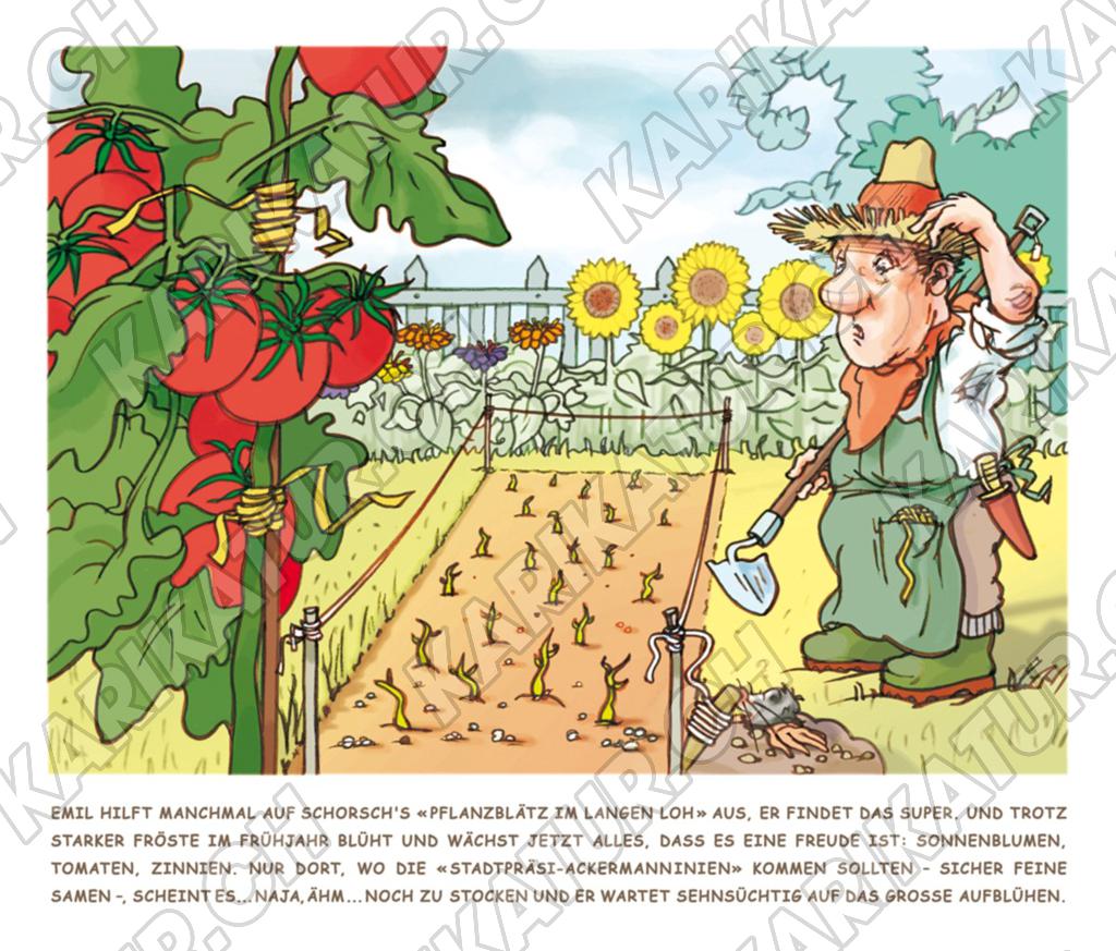 Tags: Garten Cartoon farbig Zeitung Blumen Pflanzen Emil Möggli Basel Gärtner Beet Sonnenblume Tomaten Regierungspräsidentin Ackermann
