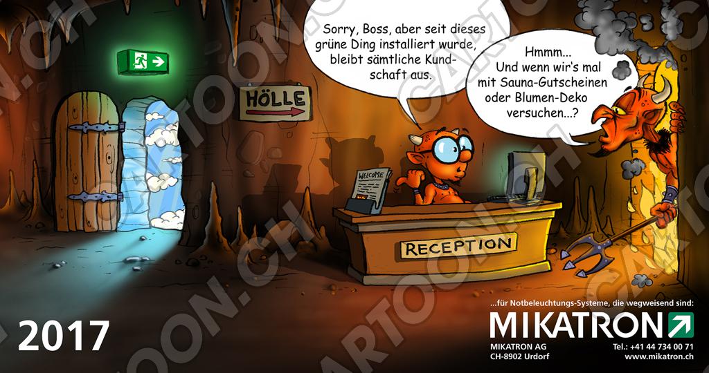 Tags: Cartoon lustig witzig farbig Werbung bunt Titelbild digital Farbe koloriert Teufel Kalender Sprechblasen Jahreskalender Notleuchten Notausgang Hölle Reception