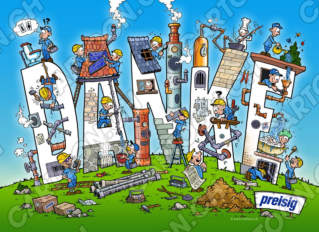 Tags: Wimmelbild Business Karte lustig witzig farbig Danke Helm Arbeit bunt Geschäft Plan Sanitär Heizung Dach Bauen Arbeiter Versand Dankeskarte Rohr Werkzeug
